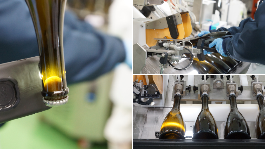 「澱抜き(デゴルジュマン)」は瓶口部分に沈殿させた滓を氷温凍結させ、一気に抜栓することで滓を除去します。瓶内の圧力により、凍らせた滓と液体が噴射するため、オリジナルの専用機を導入。液体の濁りを防ぐだけでなく、口当たりもより繊細で柔らかに仕上がります。