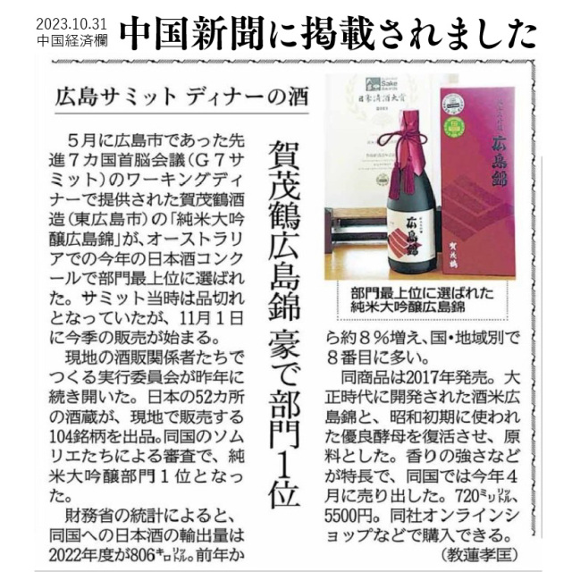 「香りは、穏やかな印象の中に上品な華やかさがあり、ライラックのような白い花の香りや、上品な米のようなまるで白玉団子のような香りも合わせ持ちます。ふわっとした、なめらかな印象を与える香りは、ホイップクリームのようで、口に含んだ瞬間、広島のお酒の特徴である、やわらかでふくよかな甘味を感じる印象から始まり、そこに旨みが加わりながら広がります。」2017/7/26新商品「広島錦」 プレス発表会@渋谷 BA-TSU ART GALLERYにてソムリエ 田崎真也さんのコメント(抜粋)