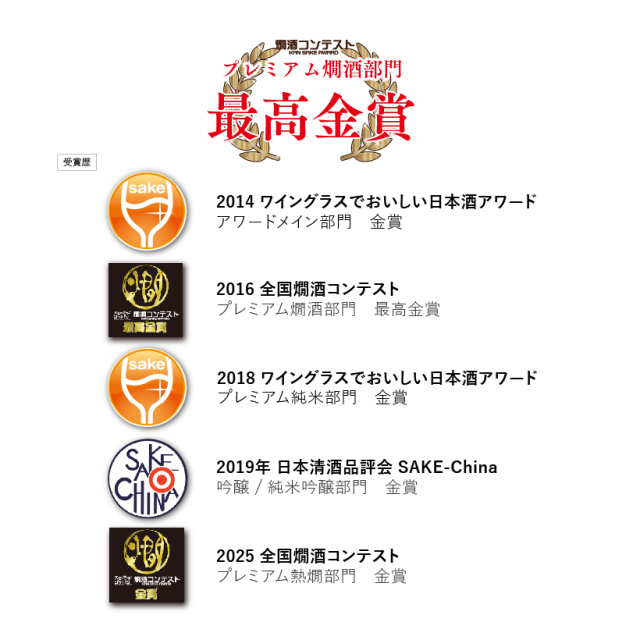 2016年には温めて美味しい日本酒を専門家が選ぶ大会「全国燗酒コンテスト」プレミアム燗酒部門で最高金賞に選ばれました。