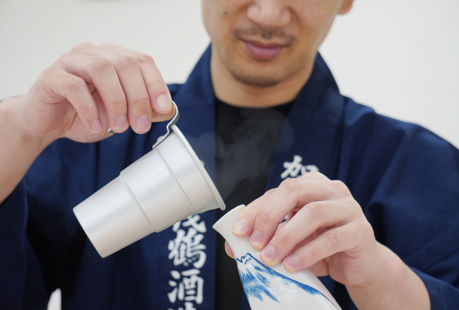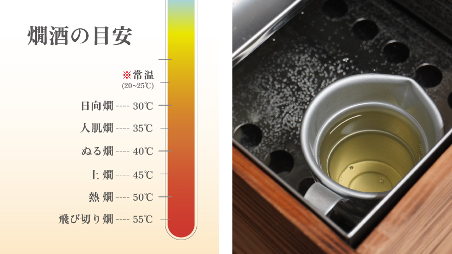 では中須賀杜氏の「好みの飲み方」をご紹介。まず、熱々になるまでお酒を温めます。温度は50~60度くらい。しっかり温めきり、飲みながら、ゆっくりと冷ましていきます。40度前後まで下がった「ぬる燗」の温度帯が飲み頃で、より飲み口に柔らかさが増します。口の中で米の旨味が、より広がります。